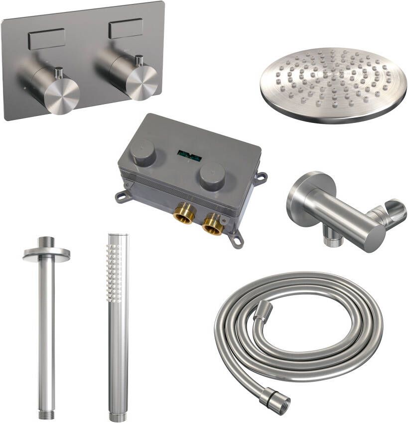 Brauer Brushed Edition thermostatische inbouw regendouche met drukknoppen SET 53 met 20 cm douchekop en plafondarm en staaf handdouche en doucheslang en wandaansluitbocht RVS geborsteld PVD