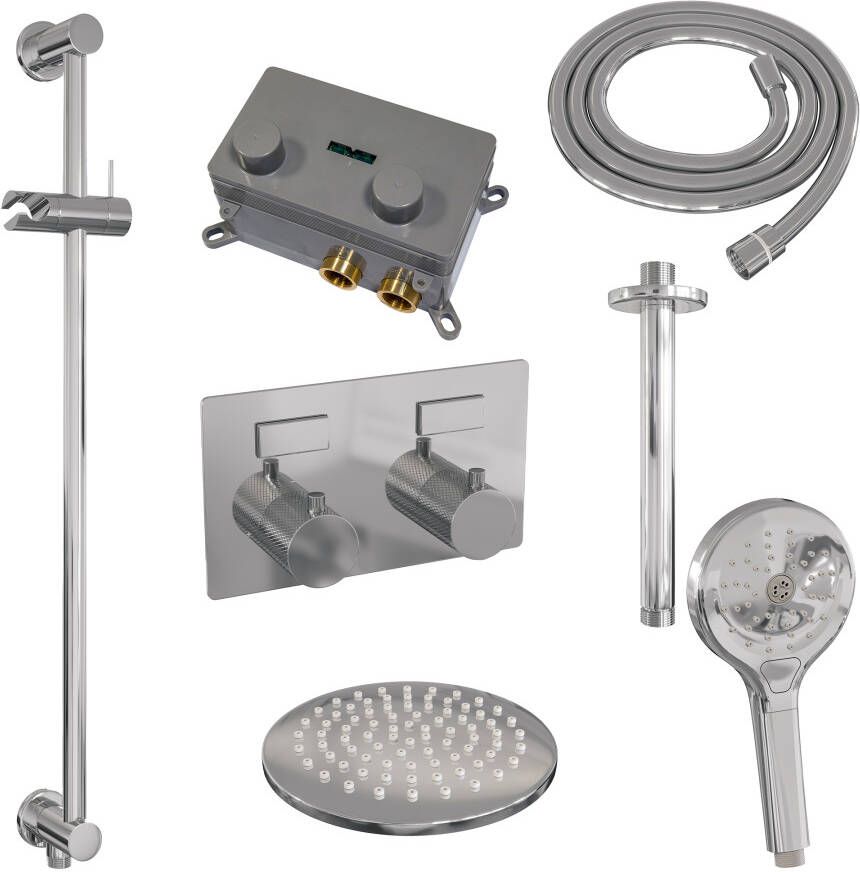Chrome Carving thermostatische regendouche met drukknoppen SET 71: 20 cm douchekop, plafondarm, 3-standen handdouche, doucheslang en gentegreerde glijstang. Een complete douchedouche set voor een luxueuze douche-ervaring