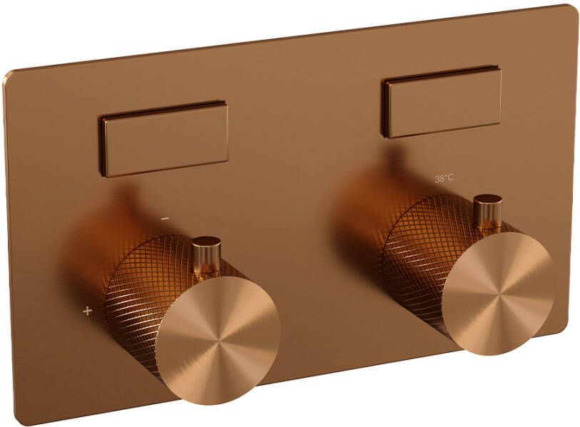Brauer Copper Carving thermostatische inbouw regendouche met drukknoppen SET 56 met 30 cm douchekop en rechte muurarm en 3-standen handdouche en doucheslang en wandaansluitbocht koper geborsteld PVD