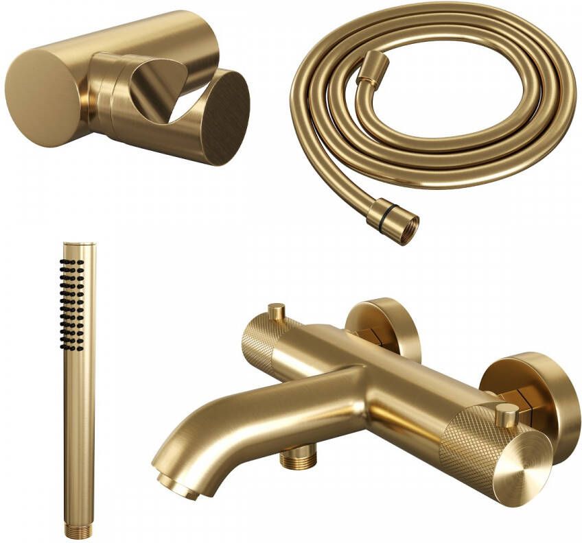 De Gold Carving thermostaatkraan SET 03 met wandhouder, handdouche en doucheslang in goud geborsteld PVD is een luxe toevoeging aan jouw badkamer. Geniet van stijl en functionaliteit met deze set