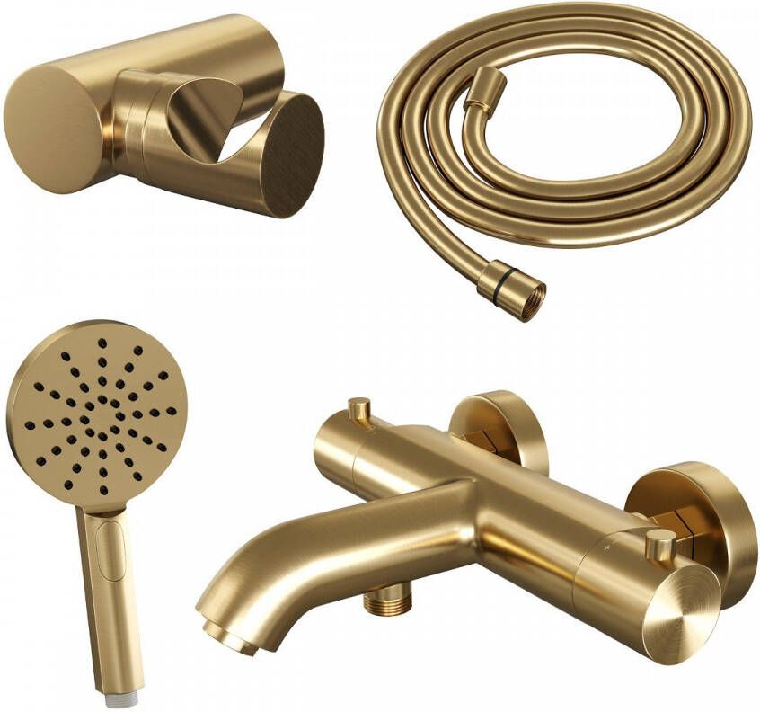 Badkraan Brauer Gold Edition Set 04 Thermostatisch Opbouw Rond Geborsteld Goud PVD 2 Greeps met Wandhouder en Handdouche 3 Standen