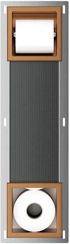 Bent u op zoek naar een inbouw toiletrolhouder met een reserverolhouder voor in uw badkamer of toilet? Dan is deze toiletrolhouder zonder klep van Wiesbaden uit de serie Rocko echt iets voor u. Deze reserverolhouder is 74 cm hoog, 20.8 cm breed en 14.2 cm diep. Hij heeft de kleur geborsteld brons koper. Door deze op uw toilet in te bouwen heeft u altijd toiletrollen bij de hand, maar zitten ze niet zo in het zicht. Alleen de onderste rol is zichtbaar en doordat ze in de houder zitten, kan er ook minder stof op de rollen terecht komen. Met deze houder komen praktisch en design mooi elkaar.